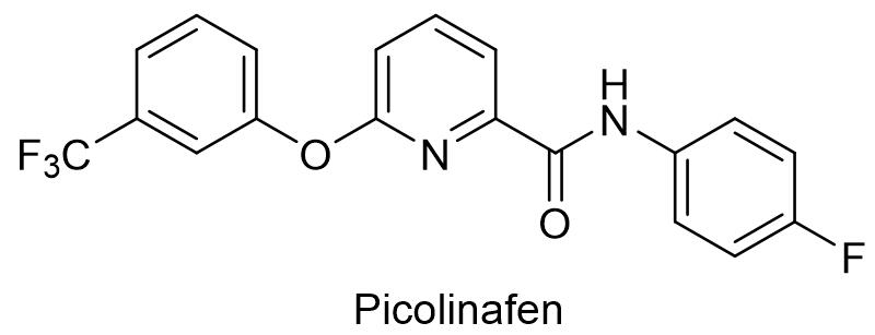 氟啶草酮是一种类胡萝卜素生物合成抑制剂,通过抑制八氢番茄红素去饱和酶来增强叶绿素的降解,最终抑制光合作用造成植物死亡。氟啶草酮是一种内吸传导型除草剂,可被植物的根吸收并传导至叶片。用于防除棉田杂草时,对棉花安全性高,持效期长,对阔叶杂草如马泡瓜、反枝苋、长芒苋、苘麻和鳢肠具有很高的活性,对禾本科杂草如狗尾草、牛筋草、稗草和马唐等也具有良好防效。氟啶草酮既可以用于喷雾,也可以用于土壤处理[22]。Eli Lilly最早报道的化合物专利是US1974501424。迈克斯(如东)化工有限公司登记了99%氟啶草酮原药和42%氟啶草酮悬浮剂,悬浮剂用量30~40 mL/亩防治棉花田一年生杂草。3.4 氟吡酰草胺氟吡酰草胺是壳牌发现的吡啶酰胺类除草剂,英文通用名:Picolinafen,CAS登记号:137641-05-5,分子式:C19H12F4N2O2,相对分子质量:376.30,化学结构式如下: