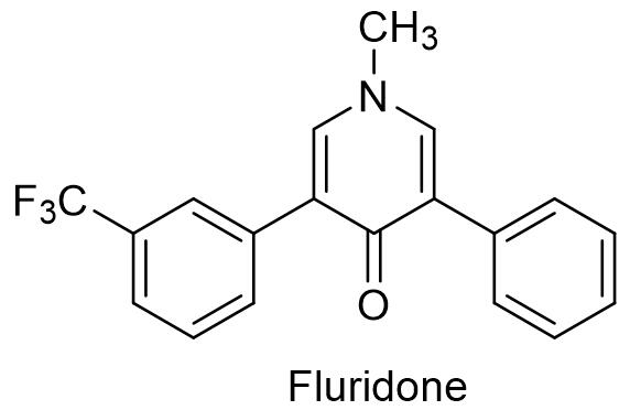 三唑磺草酮突破了HPPD类除草剂在水稻田只能用于土壤处理的局限,是第1个可以采用苗后茎叶处理方式来防治禾本科杂草的HPPD抑制剂类除草剂。三唑磺草酮可有效防治当前稻田对ALS抑制剂、ACC抑制剂、激素类抑制剂和酰胺类除草剂等有抗性的稗草,对ACC抑制剂产生抗性的千金子也具有良好防效。三唑磺草酮作用速度快,见效速度与光照强度关系密切,杂草中毒症状显著,首先叶片发白,后期逐渐萎焉,最终完全枯萎死亡。在合适的施药时期,三唑磺草酮也具有显著的土壤处理活性[21]。清原农冠具有优先权的化合物专利是CN201511030154。清原农冠在国内登记了95%三唑磺草酮原药,6%三唑磺草酮可分散性油悬浮剂和28%的三唑磺草酮·敌稗可分散性油悬浮剂,单剂用于防治直播水稻田稗草时,制剂用量115~150 mL/亩,用于移栽水稻田时,东北地区200~250 mL/亩,其他地区150~180 mL/亩,混剂用于防治直播水稻田稗草,制剂用量是200~250 mL/亩。3.3 氟啶草酮氟啶草酮是Eli Lilly最早报道的吡啶酮类除草剂,英文通用名:Fluridone,CAS登记号:59756-60-4,分子式:C19H14F3NO,相对分子质量:329.32,化学结构式如下: