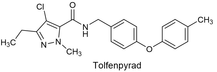 双丙环虫酯拥有独特的化学结构和新颖的作用机理,作用机理与吡啶甲亚胺衍生物杀虫剂吡蚜酮和pyrifluquinazon类似,属于弦振器官香草素受体亚家族通道调节剂,通过作用于神经系统的一种或多种蛋白质而显示出杀虫活性,施药数小时内害虫停止取食,击倒作用慢,持效期长,叶片渗透力强。双丙环虫酯能能有效防治刺吸式口器害虫和吮吸式口器害虫,例如蚜虫、粉虱、木虱、介壳虫、粉蚧和叶蝉等,可降低因昆虫介体传播的病毒病和细菌性病害,适用于经济作物、大田作物和观赏植物等,适用于叶面处理,种子处理和土壤处理[16]。明治制果药业株式会社与北里研究所拥有优先权的化合物专利是JP2005161019。巴斯夫公司登记了92.5%双丙环虫酯原药,50 g/L双丙环虫酯可分散液剂(商品名英威®)和75 g/L双丙环虫酯·阿维菌素可分散液剂(英雷®),英威®用于防治多种果蔬作物上的蚜虫和粉虱,对蚜虫的制剂用量10~16 mL/亩,对粉虱的制剂用量是55~65 mL/亩;英雷®用于防治番茄烟粉虱、黄瓜蚜虫和辣椒烟粉虱,蚜虫的制剂用量9~13 mL/亩,烟粉虱的制剂用量45~53 mL/亩。 2.2 唑虫酰胺唑虫酰胺为原日本三菱化学公司(其农药部分现属日本农药公司)发明的新颖杀虫杀螨 剂,英文通用名:Tolfenpyrad,登录号:129558-76-5,分子式:C21H22ClN3O2,相对分子质量:383.87,化学结构式如下: