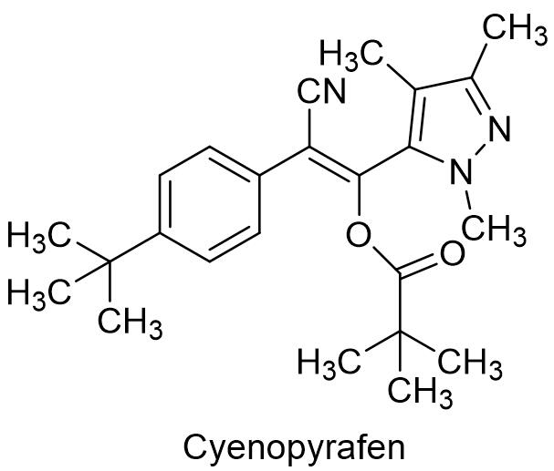 螺螨双酯的作用机制是抑制害螨体内脂肪合成和阻断能量代谢。螺螨双酯属于非内吸性杀螨剂,通过触杀和胃毒防治卵、弱螨和雌成螨。螺螨双酯对全爪螨属、叶螨属、始叶螨属和瘿螨属等具有良好的防效,可用于柑橘、葡萄、茄子和辣椒等作物上有害螨类的防治。青岛科技大学具有优先权的化合物专利是CN201110002988。浙江宇龙登记了95%螺螨双酯原药和24%螺螨双酯悬浮剂,悬浮剂稀释3600~4800倍防治柑橘红蜘蛛。2.4 腈吡螨酯腈吡螨酯是由日产化学工业株式会社开发的新型丙烯腈类杀螨剂,英文通用名:Cyenopyrafen,开发代号:NC-512,CAS登记号:560121-52-0,分子式:C24H31N3O2,相对分子质量:393.52,化学结构式如下: