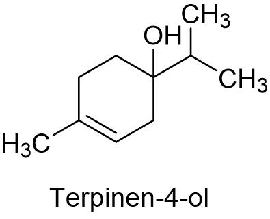 氟烯线砜是非熏蒸性杀线虫剂,作用机制是通过触杀作用于线虫,线虫接触到此物质后活动减少,进而麻痹,暴露1 h后停止取食,侵染能力和产卵能力下降,卵孵化率下降,孵化的幼虫不能成活,具有不可逆的杀线虫作用,作用机制不同于传统杀线虫药剂。氟烯线砜可以防治农业中多种有害的线虫,例如爪哇根结线虫、南方根结线虫、北方根结线虫、刺线虫、马铃薯白线虫、哥伦比亚根结线虫、玉米短体线虫和花生根结线虫等,适用于番茄、辣椒、秋葵、茄子、黄瓜、西瓜、哈密瓜和南瓜等水果和蔬菜作物中的线虫防治[11]。日本拜耳具有优先权的化合物专利是JP1999191638。安道麦马克西姆有限公司在国内登记了氟烯线砜95%原药和40%氟烯线砜乳油,用于防治黄瓜根结线虫,制剂用量500~600 mL/亩。1.13 互生叶白千层提取物互生叶白千层提取物含有一种天然的萜烯醇物质,互生叶白千层提取物英文名称:Melaleuca alternifolia extract,含有的萜烯醇为4-甲基-1-(1-甲基乙基)-3-环己烯-1-醇,英文通用名:Terpinen-4-ol,CAS登记号:562-74-3,分子式:C10H18O,分子量:154.25,化学结构式如下: