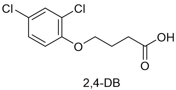 氟吡酰草胺可以抑制类胡萝卜素的合成,通过抑制杂草体内八氢番茄红素去饱和酶的活性,致使杂草植物细胞叶绿素被破坏及细胞破裂,最终导致杂草白化死亡。氟吡酰草胺具有低毒、除草性能高、作用时间长、对农作物毒副作用小和杀草谱宽等优点,被开发为谷物类作物的除草剂,对一年生禾本科杂草和阔叶杂草都有良好的抑制和防除作用,对禾本科的稗草,阔叶类的拉拉藤、野生堇菜和大穗看麦娘等有优良防效。壳牌最早报道的化合物专利是GB19905965。先达登记了96%氟吡酰草胺原药和20%氟吡酰草胺悬浮剂,悬浮剂用量17~20 mL/亩防治冬小麦田一年生阔叶杂草。3.5 2,4-滴丁酸2,4-滴丁酸早在上世纪40年代就被报道,英文通用名:2,4-DB,CAS登记号:94-82-6,分子式:C10H10Cl2O3,相对分子质量:249.09,化学结构式如下: