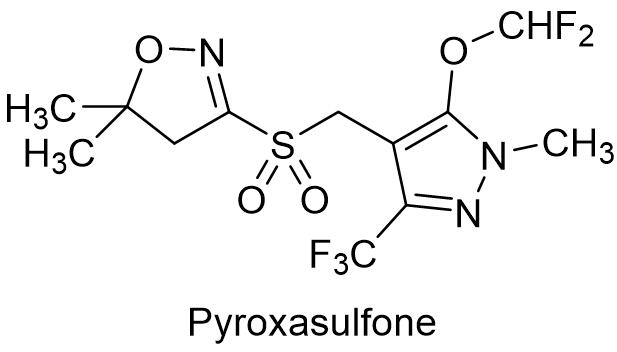 2,4-滴丁酸是激素类除草剂2,4-D的类似物,作用方式不同于常见激素类除草剂,2,4-滴丁酸本身没有生物活性,吸收后被β-氧化酶氧化成2,4-滴而起作用,在苜蓿、玉米和水稻等作物中,由于β-氧化酶活性低,代谢不了2,4-滴丁酸,对这些作物表现高度的安全性。2,4-滴丁酸对水稻田的恶性杂草野慈姑、泽泻和江稗等,以及莎草科杂草具有良好防效,效果明显好于2-甲-4-氯。先达公司登记了95%的2,4-滴丁酸原药和30%的2,4-滴丁酸钠盐可溶液剂(商品名:莎阔佳®),莎阔佳用于防治水稻移栽田的一年生阔叶杂草及莎草科杂草,制剂用量150~200 mL/亩。3.6 砜吡草唑 砜吡草唑是日本组合化学公司开发的异噁唑类除草剂,英文通用名:Pyroxasulfone,开发代号:KIH-485、KUH-403,CAS登记号:447399-55-5,分子式:C12H14F5N3O4S,相对分子质量:391.31,化学结构式如下: