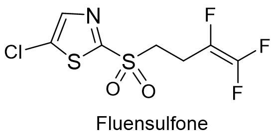 多果定是是破坏细胞的渗透性,导致细胞内含物的外渗和细胞死亡,具有保护和一定治疗作用。多果定用于多种作物上防治多种病害,例如苹果、梨、山核桃、樱桃、草莓、桃、无花果树和黑胡桃等果树,以及蔬菜、坚果和观赏植物等作物上的黑斑病、叶斑病、褐腐病、花烂病、枯萎病和霜霉病等,既可茎叶处理又可土壤处理。 如东县华盛化工有限公司登记了98%多果定原药和50%的多果定悬浮剂,其悬浮剂用于防治黄瓜枯萎病,制剂用量120~160克/亩。1.12 氟烯线砜氟烯线砜是马克西姆(现安道麦)发现的噻唑砜类杀线虫剂,英文通用名:Fluensulfone,开发代号:MCW-2,CAS登记号:318290-98-1,分子式:C7H5ClF3NO2S2,分子量:291.70,化学结构式如下:
