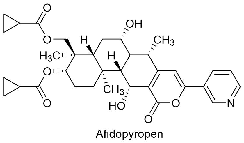 补骨脂种子提取物具有杀菌谱广、免疫诱抗和促进生长的特点,并且无残留隐患,对环境安全。作用机理是通过破坏病原菌的细胞壁、细胞膜、线粒体膜和核膜等壁膜系统,干扰细胞代谢过程而达到杀菌的目的。补骨脂种子提取物对水稻稻瘟病、苹果腐烂病、早晚疫病和炭疽病等植物病害防治效果显著[12]。沈阳同祥生物农药有限公司登记了补骨脂种子提取物1.5%的母药,补骨脂种子提取物的0.2%微乳剂,其微乳剂用于防治水稻稻瘟病,制剂用量45~60 mL/亩。1.15 侧孢短芽孢杆菌A60侧孢短芽孢杆菌A60的英文通用名:Bacillus parasporus A60。侧孢短芽孢杆菌A60是微生物类杀菌剂,作用机理是抑制辣椒疫霉菌菌丝生长、孢子囊产生和休止孢萌发,对辣根疫霉菌有强烈的抑制及杀灭作用,也可以保护辣椒幼苗免受辣椒疫霉菌游动孢子致病性的伤害。活性成分喷洒在作物叶片上后,成功定植到植物根际、体表或体内,与病原菌竞争植物周围的位点,改变周围菌群环境和种类,具有预防和治疗双重效果[13]。陕西美邦药业集团股份有限公司登记了50亿cfu/mL侧孢短芽孢杆菌A60母药,5亿cfu/mL侧孢短芽孢杆菌A60悬浮剂,用于防治辣椒疫病,制剂用药量是50~60 g/亩。1.16 解淀粉芽孢杆菌Lx-11解淀粉芽孢杆菌Lx-11的英文通用名:Bacillus amyloliquefaciens Lx-11。解淀粉芽孢杆菌Lx-11是江苏省农科院植保所开发的生物杀菌剂,用到水稻病害防治,该菌株能代谢产生surfactin、bacillomycin D和fengycin等3类脂肽类抗生素,诱导植株3个防卫反应基因PR-1a、PR-1b、PAL和1个转导基因NPR1的超量表达,在处理24 h后达到最大值,可以显著降低细菌性条斑病菌对水稻植株的侵染[14]。江苏省苏科农化有限责任公司登记了60亿cfu/mL解淀粉芽孢杆菌Lx-11悬浮剂(商品名:叶斑宁),用于防治水稻白叶枯病和细菌性条斑病,制剂用量500~650 g/亩。 1.17 β-羽扇豆球蛋白多肽β-羽扇豆球蛋白多肽的英文通用名:Banda de Lupinus albus doce,简写为BLAD。β-羽扇豆球蛋白多肽是白羽扇豆在萌发过程中产生的天然多肽,从其发芽种子提取获得。β-羽扇豆球蛋白多肽防治白粉病孢子、灰霉病菌和念珠菌等病害时,可与化学杀菌剂媲美。活性物质与真菌细胞膜上的糖蛋白有极高亲和力,通过高亲和力及非特异性结合后,与真菌交互作用,导致真菌细胞因许多细胞膜上气孔堵塞或关闭,并在几小时内死亡。该产品可用于草莓、葡萄、番茄和核果等[15]。 葡萄牙塞埃韦有限责任公司登记了20% β-羽扇豆球蛋白多肽的可溶液剂,用于防治草莓灰霉病,使用剂量603~840 g/hm2。 1.18沼泽红假单胞菌PSB-S嗜硫小红卵菌HNI-1 的英文通用名:Rhodopseudomonas palustris PSB-S。长沙艾格里生物科技有限公司登记的生物杀菌剂沼泽红假单胞菌PSB-S悬浮剂,有效成分含量是2亿CFU/mL,防治辣椒花叶病用量180~240 mL/亩,防治水稻稻瘟病用量300~600 mL/亩。1.19 嗜硫小红卵菌HNI-1嗜硫小红卵菌HNI-1 的英文通用名:Rhodovulum sulfidophilus HNI-1。长沙艾格里生物科技有限公司登记的生物杀菌剂嗜硫小红卵菌悬浮剂,有效成分含量是2亿CFU/mL,防治番茄根结线虫用量400~600 mL/亩,防治番茄花叶病用量180~240 mL/亩,防治水稻稻曲病用量是200~400 mL/亩。 2. 杀虫剂2019新登记的杀虫/杀螨剂共54个,涉及首次登记的化学原药4个和生物杀虫剂3个。化学杀虫剂包括取食抑制剂类的杀虫剂双丙环虫酯,电子传递抑制剂类的杀虫杀螨剂唑虫酰胺,脂肪合成抑制剂类的杀螨剂螺螨双酯,以及线粒体抑制剂类的杀螨剂腈吡螨酯。生物杀虫剂包括银杏果提取物,绿盲蝽性信息素和二化螟性诱剂。2.1 双丙环虫酯双丙环虫酯是日本明治制果药业株式会社与北里研究所共同研发的生物源衍生物杀虫剂,英文通用名:Afidopyropen,开发代号:ME5343CAS,登录号:915972-17-7,分子式:C33H39NO9,相对分子质量:593.66,化学结构式如下: