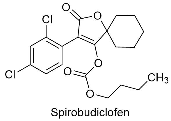 唑虫酰胺具有良好的杀虫杀螨活性,对白粉病等真菌病害也有相当效果,作用机制是抑制电子传递体系组成之一的复合体I (Complex I)的电子传递,对昆虫与真菌为同一作用机理。唑虫酰胺具有广谱、高效和速效性好的特性,对鳞翅目、半翅目、蓟马目、甲虫类、膜翅目、双翅目和螨类均防效良好。唑虫酰胺不仅对害虫的卵、幼虫和成虫高活性,而且对鳞翅目类和甲虫类害虫还有抑食作用,在低剂量下可忌避害虫。唑虫酰胺广泛用于甘蓝、大白菜、黄瓜、茄子、番茄、菊花、萝卜、西瓜和茶树等作物上多种害虫的防治[17]。日本三菱化学公司具有优先权的化合物专利是JP1988258930。唑虫酰胺曾经在国内获得多个原药和制剂产品的临时登记,但均已失效,2019年海利尔获得98%唑虫酰胺正式登记,登记的15%唑虫酰胺悬浮剂和20%虫螨腈·唑虫酰胺悬浮剂均用于防治甘蓝小菜蛾,前者制剂用量30~50 mL/亩,后者制剂用量30~40 mL/亩。2.3 螺螨双酯螺螨双酯是青岛科技大学发现,由浙江宇龙开发的季酮酸酯类杀螨剂,英文通用名:Spirobudiclofen,CAS登记号:1305319-70-3,分子式:C20H22Cl2O5,相对分子质量:413.29,化学结构式如下: