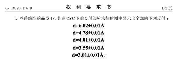 其次,化合物专利之后可能存在晶型专利。比较典型的例子就是吡唑醚菌酯这个品种。上述文章仅仅列明了其化合物专利CN1068313B,2015年6月20日到期。实际上,在申报了化合物专利十一年之后,BASF于2006年6月19日又申请了一篇晶型专利:唑菌胺酯的晶型。经过国家知识产权局的审查,这份专利申请于2012年9月授权,授权号CN101203136B。在美国,这份专利的晶型II和IV都授权了。在中国和欧洲,只有晶型IV授权了。中国专利授权文本中,权利要求1保护的是晶型IV,具体内容如下: